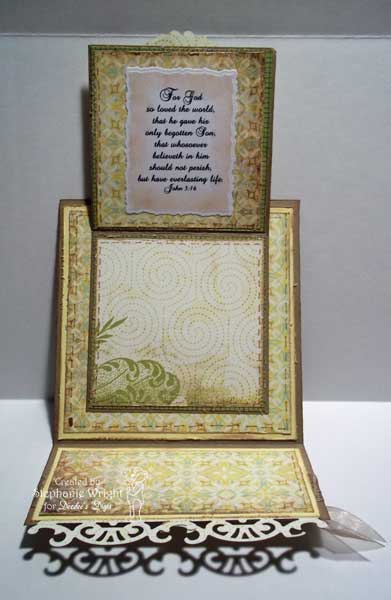 Here are a few more pictures so you can see the interior and other details. I used a SU journaling pen for some faux stitching. I distressed the edges of my cardstock & patterned paper and then inked them. I also sponged my focal image before removing it from the nesties die.