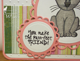 If you know me IRL (in real life), you know I LOVE cats. So, when I saw this Purfect Friend digi set from Sweet 'n Sassy Stamps, I just HAD to have it. :) We have three cats and "my" cat is a Russian Blue named Sasha. {I emphasized the "my" because if you know cats: they don't have owners, they have staff.} So, I chose to color the kitty on my card gray in her honor. I used SSS102 for my card design.