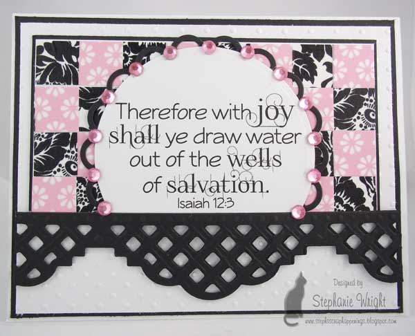 I adhered the gingham paper to the white panel (round the opposite corners first). Then I used an oval die to cut a "window" in it. I used the same die to cut out the middle of a floral oval die cut. I used this die one more time with a scalloped oval to finish the frame. After assembling the frame, I adhered it to the gingham panel. The Scripture was attached behind the panel with pop dots, then the entire panel was adhered to the card base with more pop dots.