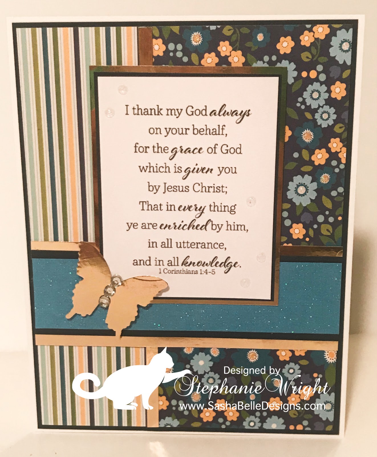 I used Mojo Monday's sketch #477 for the inspiration for my card today. I used the measurements provided by Kristie Marcotte as a guide but didn't stick to them exactly. I love these papers by Pebbles and in fact this is my 2nd 6 x 6 pad of this design. I added some gold foil paper for some shine and some white blizzard Nuvo drops on some flower centers and around the verse for some sparkle. The card remains pretty flat and will be easy to mail.
